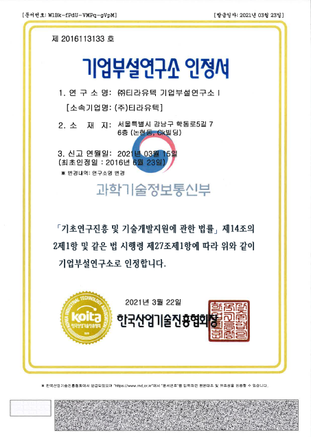 티라유텍은 순수 원천 기술을 바탕으로 주요 인증과 특허를 다수 보유하고 있습니다.