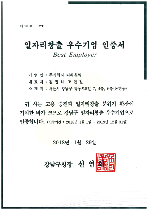 Certificate of the Excellent Workplace Seoul type Small Hidden Champion